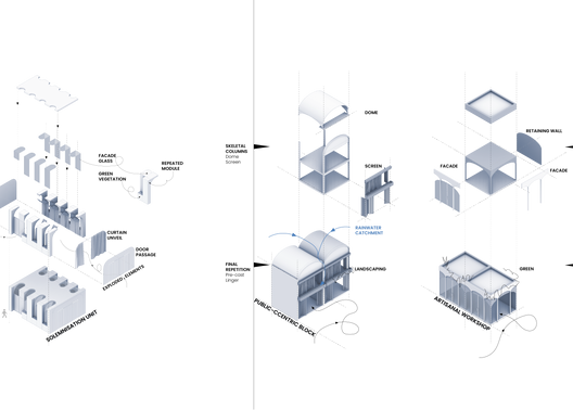 The Artisanal Commons explores the preparation process of simple yet extravagant solemnization for straightforward couples in Singapore. It aims to cultivate multi-generational ties through traditional crafting workshops, despite the primary function of serving ROM. With a surrounding site context of heritage and of the arts, the Artisanal Commons is a contemporary statement that bridges modernity and traditional crafts. The expanse of the building represents strength as arches, spanning across two individuals, signifying union between two people. The recurring motif forms in thresholds, pathways and the extents of the building. Following closely to a clean and form-centric style, the expanse of the Artisanal Commons creates atypical shadows and ambiences suitable for the spatial program.