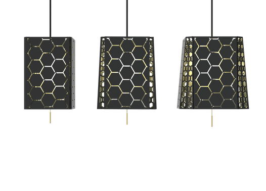 ‘Labrix’ uses a simple mechanism similar to umbrellas where the panels can be adjusted manually to change the shape of the lamp to cast the preferred effect of labyrinth shadows. With a simple pull of the rope, the user can change the brightness and shadows of the environment, hence adding to the interior effect of the surrounding..